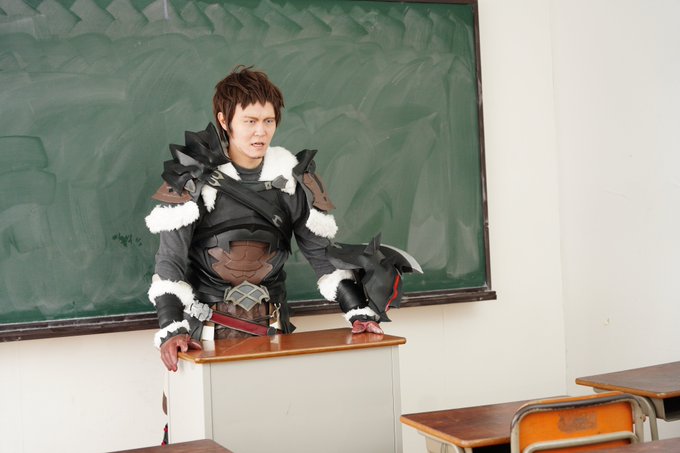 ※ネタ写 3年XIV組ー!アルバート先生ー!! Photo:@renjaijai 「よぉしお前ら席に着けー! 今日は第一世界の今についてやっていくぞー」 #FF14cosplay #ffxivcosplay
