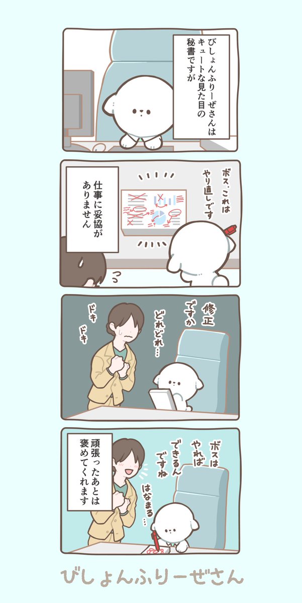 #びしょんふりーぜさん 可愛い見た目に反して厳しくて...🐕 しっかり添削やアドバイスをくれる #秘書 がいい方には、 びしょんふりーぜさんがおすすめ✏️ 可愛いわんこに厳しくされるのもまた一興…? #ヒショワン株式会社 #ヒショワン #4コマ漫画