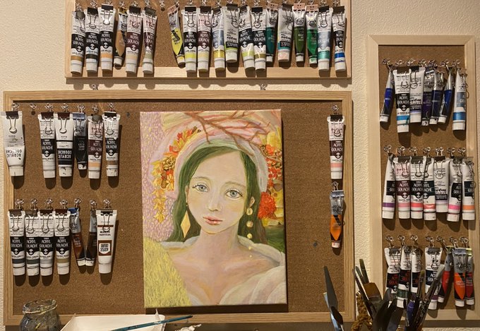 絵の具の色探すの大変だったから100均DIYでコルクボードとクリップ買ってお絵描きスペース完成しました! めちゃくちゃ探しやすくなった! 占めて500円✨ (画像の絵は描きかけ) #絵描きさんと繫がりたい