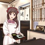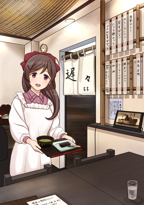 先日、呉の「和かふぇ 遅々」さんへ行ってきました。 こちらで販売されている「間宮羊羹」が美味しくて、以前からよく購入して食べていたのですが、今回は店内でお食事が出来たので、とても嬉しかったです。 間宮さんが提督さんに「抹茶(間宮羊羹付)」を出しているイメージで描いてみました。 #艦これ