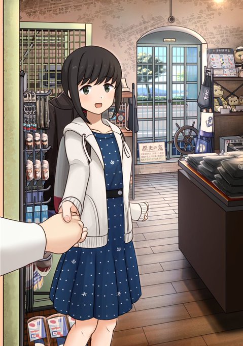 呉中央桟橋ターミナルにある「呉湾艦船めぐり」公式オフィシャルショップが好きで、時折立ち寄っています。オリジナルグッズや艦船模型、地元食材・地酒など、どれも心惹かれる素敵なものばかりなので、色々と欲しくなってしまいます。 電ちゃんがお買物に来ているイメージで描いてみました。 #艦これ
