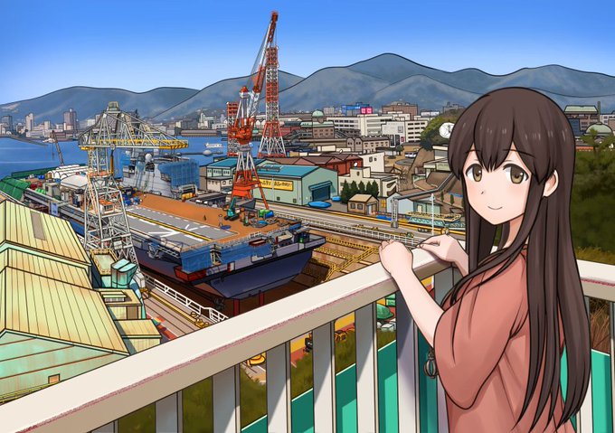 557 1709 昨年の3月頃からJMU呉事業所さんのドックに入渠している「護衛艦かが」ですが、前の道路を通るたびに少しずつ改修が進んでいる様子が見えて、いつ完成するかなと楽しみに思っています。 赤城さんが、歴史の見える丘の歩道橋に「護衛艦かが」を見に来ているイメージで描いてみました。 #艦これ 23/03/24 00:48