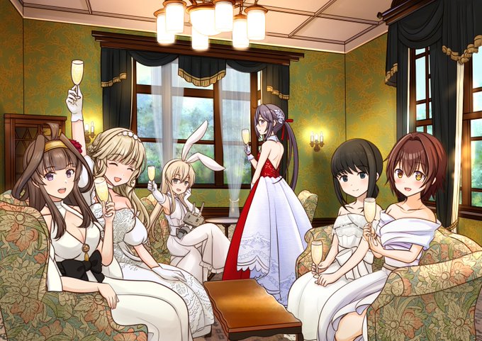 少し早いですが、艦これ10周年おめでとうございます!いつも素敵な企画で楽しませて頂き、感謝しています。 今回のローソンコラボでクリアファイルになった6人のドレス姿がとても可愛くて、入船山記念館(旧呉鎮守府司令長官官舎)の客室で、皆でお祝いをしているイメージで描いてみました。 #艦これ