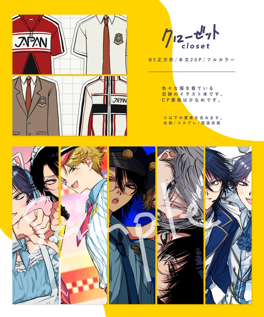【5/4 全国大会GSΩ 2023】忍跡新刊サンプル | ひ #pixiv pixiv.net/artworks/10741… 新刊サンプルです!好き勝手お着替えさせたイラスト本です!(女装/コスプレ/捏造衣装の要素を含みます)よろしくお願いします〜❗️