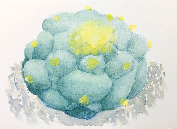 2 18 サボテン愛好家の方の 名刺用のイラスト。 黄色いところはマスキングを使わず アクリルガッシュで描いてみた。 #サボテン #ロフォフォラ #水彩画 20/12/10 16:49