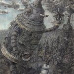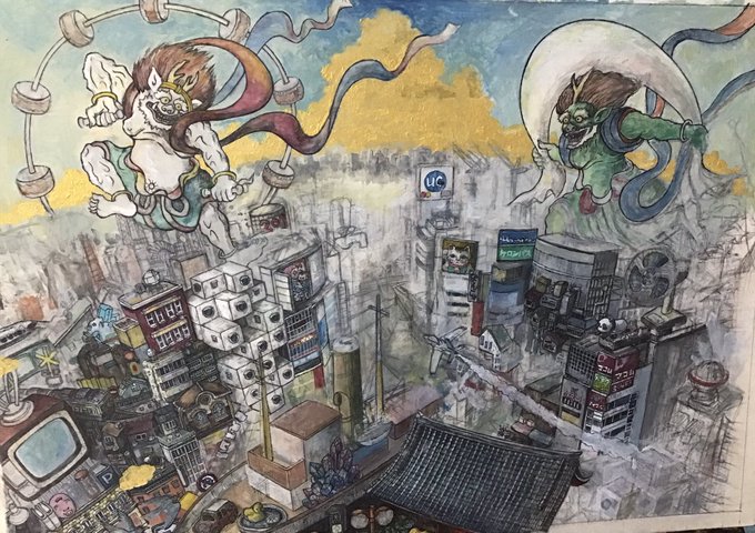 16 124 新作完成しました‼︎‼︎ 「混沌を越えて」 サイズ:277×390mm イラストボードにペン、透明水彩、不透明水彩 #ペン画 #アナログ絵 #絵 #イラスト #空想画 #細密画 #街 #風神雷神 #芸術の輪 #ink #art #illustration #artwork 21/10/23 18:03