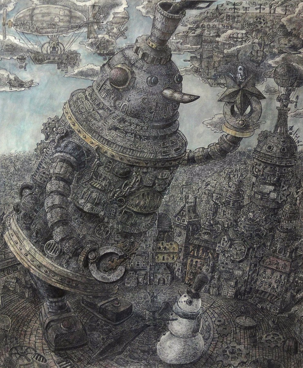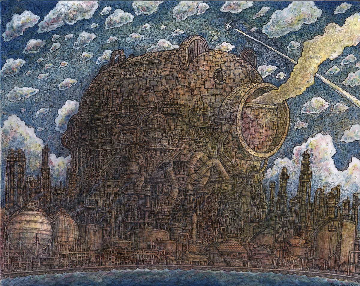 新作完成しました‼︎‼︎ 『守護者』 F3サイズ (220×273mm) ペン、透明水彩 #イラスト #絵 #アナログ絵 #ペン画 #工場 #蚊遣器 #蚊遣豚 #細密画 #空想 #芸術の輪 #illustration #art #ink #artwork #originalart