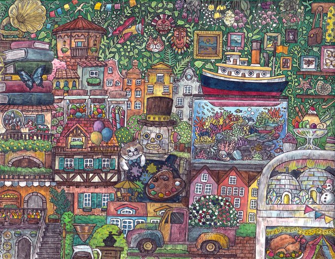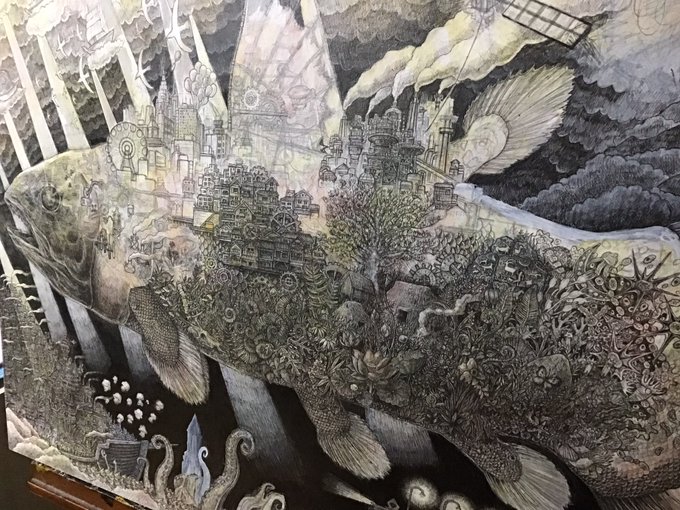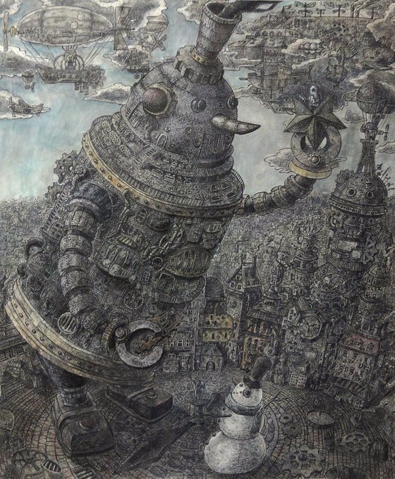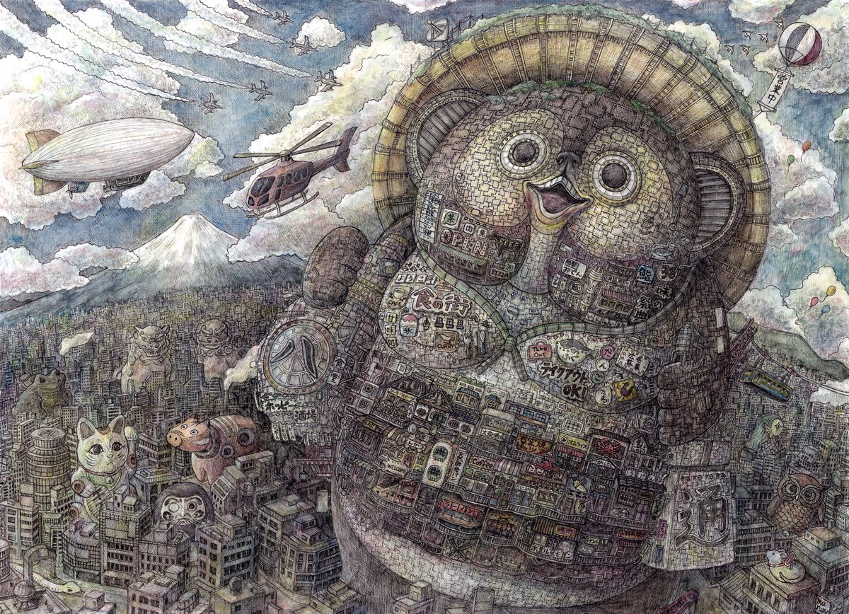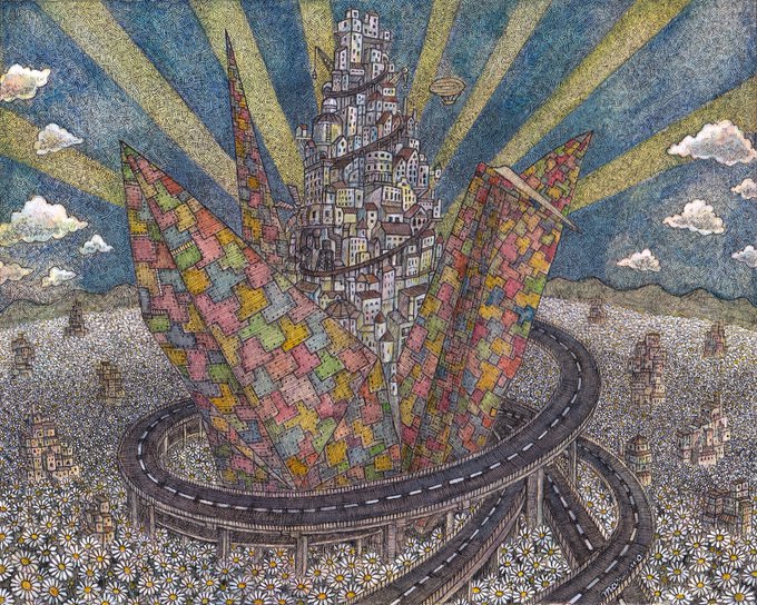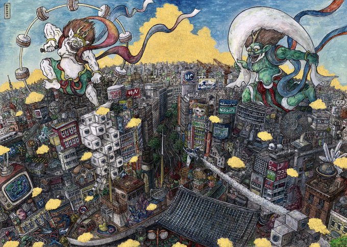新作完成しました‼︎‼︎ 「混沌を越えて」 サイズ:277×390mm イラストボードにペン、透明水彩、不透明水彩 #ペン画 #アナログ絵 #絵 #イラスト #空想画 #細密画 #街 #風神雷神 #芸術の輪 #ink #art #illustration #artwork
