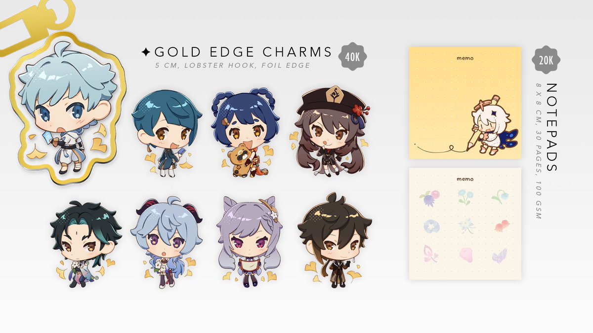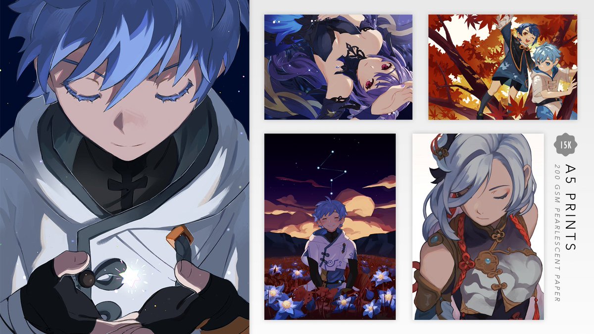 [CF16] here's my genshin + originals catalogue for #comifuro16! 🌟 i will be tabling at c19-a with my friend aya! 🥳 i've got some prints, charms, enamel pins, and notepads with me! see you there!!