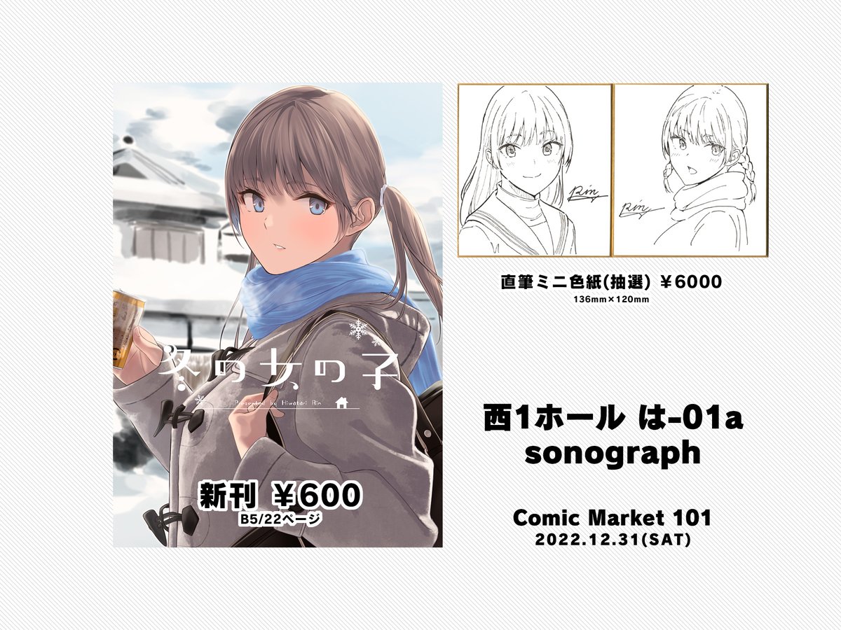 12/31(土) 西は-01a「sonograph」お品書きです! 直筆のミニ色紙は3、4枚用意出来るかなと思います。 あとカラーの色紙も1枚準備しようかと思いますがそちらについては明日か明後日お知らせ出来ればと思います。 よろしくお願いします〜 twitter.com/hiwataririn/st…