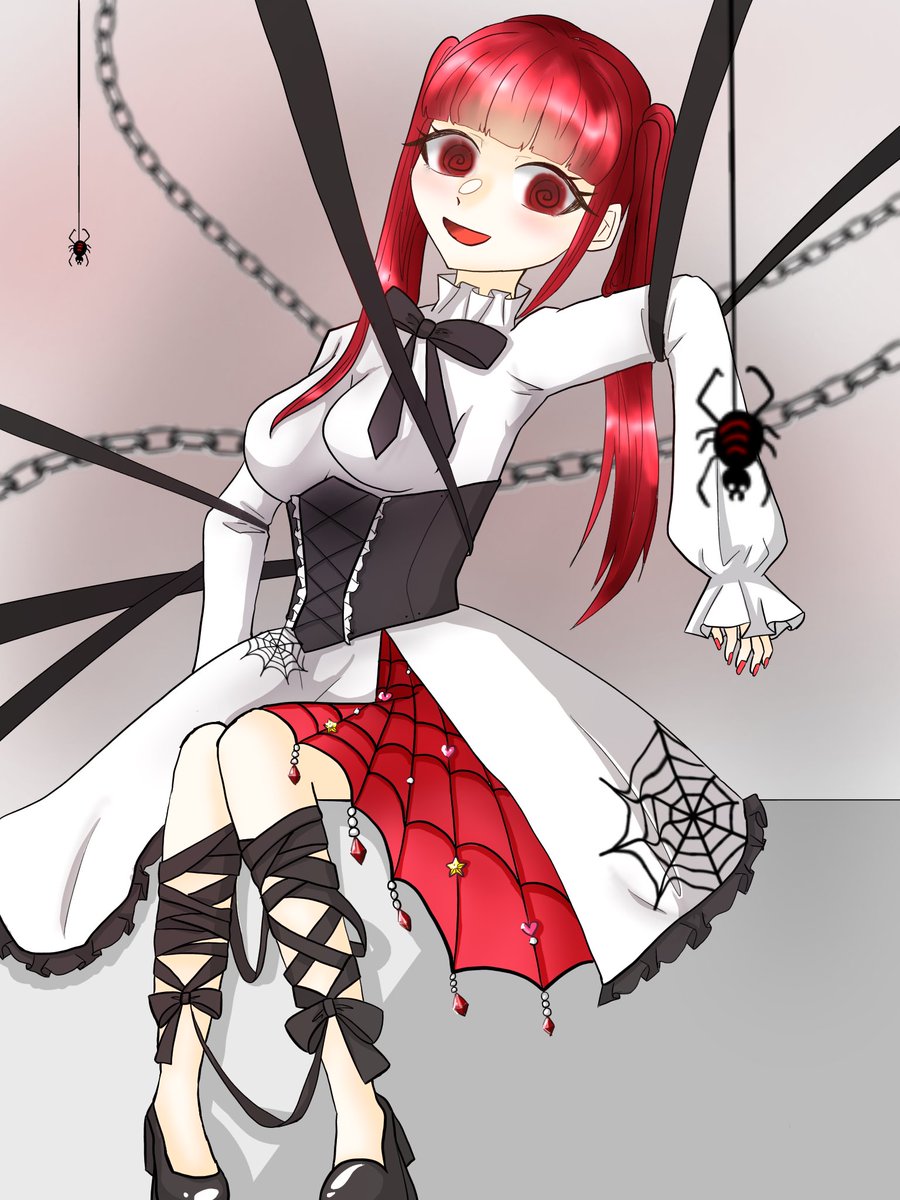 ⛓🩸🕸🕷🕸🩸⛓ ⛓ 囚われの少女 ⛓ ⛓🩸🕸🕷🕸🩸⛓ 蜘蛛はゆるく描いた…怖いから…() 背景の描き方わかんないー!😣 Tag𓂃◌𓈒𓐍 #春の創作クラスタフォロー祭り #絵描きさんと繋がたい #イラスト好きな人と繋がりたい #創作 #イラスト #デジタルイラスト