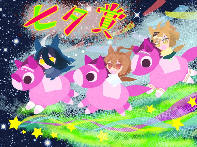 今日の七夕賞。謎の生物に乗ってるwこの3人の血統の仔たちがたくさん出走するのでめっちゃ楽しみです🐎🐎🐎😆 私が推すのはセイウンハーデス。菊花賞の逃げでセイウンスカイ(実馬)を夢見てからずっと好きになってる〜カフェ血統でごめんねタキオンw #ウマ娘 #イラスト #七夕賞