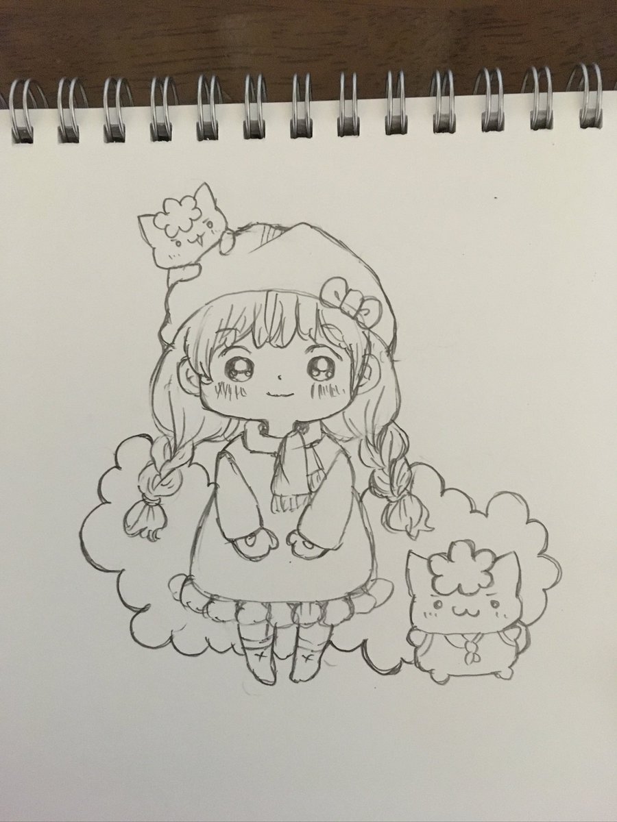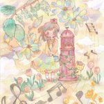 #自分の代表作だと思う絵を一枚だけ選んでみよう 一つ一つのモチーフとキャラクターのバランス、色が上手く表現できた!女の子も可愛く描けたと思う。 みぃたも参加してるし、良い絵になった。(*´-`)