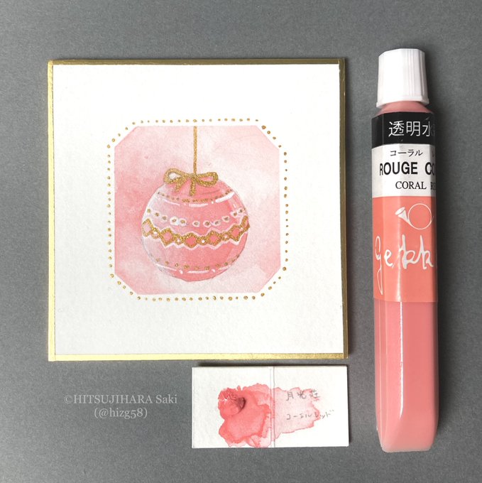 12/24 月光荘 コーラルレッド 馴染みがよい感じで好き〜。 金色は顔彩耽美(呉竹)の赤金色です。 #水彩アドベントカレンダー #透明水彩 #MerryChristmas アンケの「オーナメント」描きました。ぽちぽちありがとうございました。