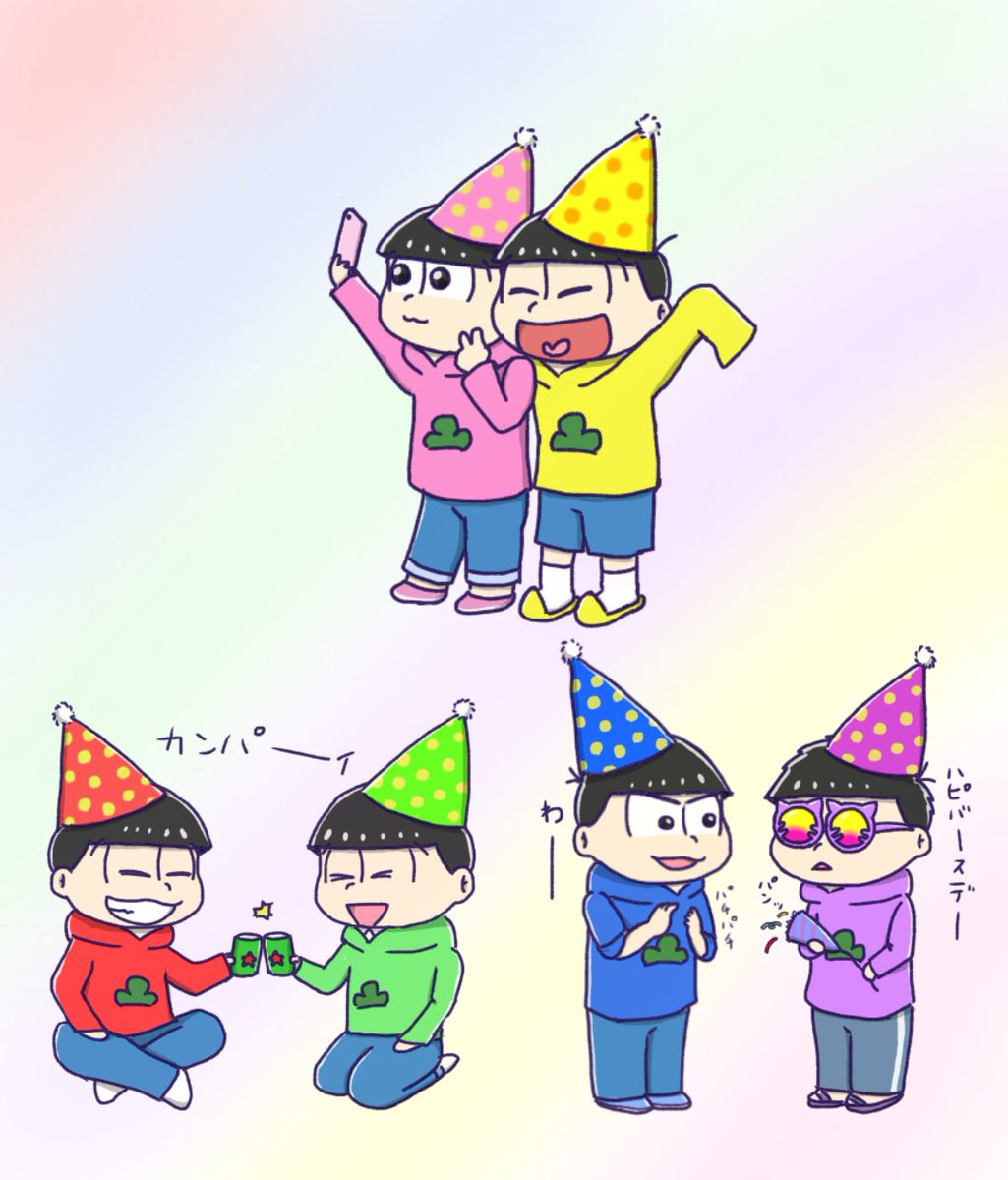 いっっけなーい遅刻遅刻ー(棒) すみませんむつごお誕絵もどきです😞 フリ〜トにポイポイ投げてたやつ。 6人まとめてが無理だったので好きなコンビでちまちま描きました 改めておたおめでした🙇♂️(まじですまん…)