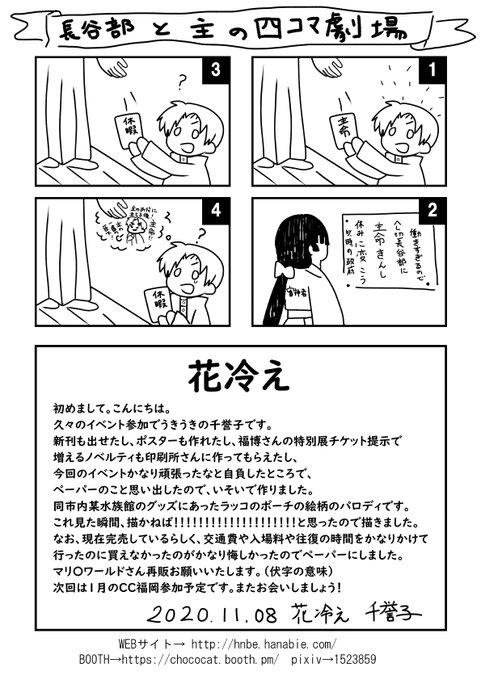 2022年11月3日(木/祝)CC福岡57、B館 く49b「花冷え」 とうらぶ(黒田組、へしさに)等。 「ゆうひ」様と隣接しております! (新刊は出たらにこさにの予定です) chococat.booth.pm