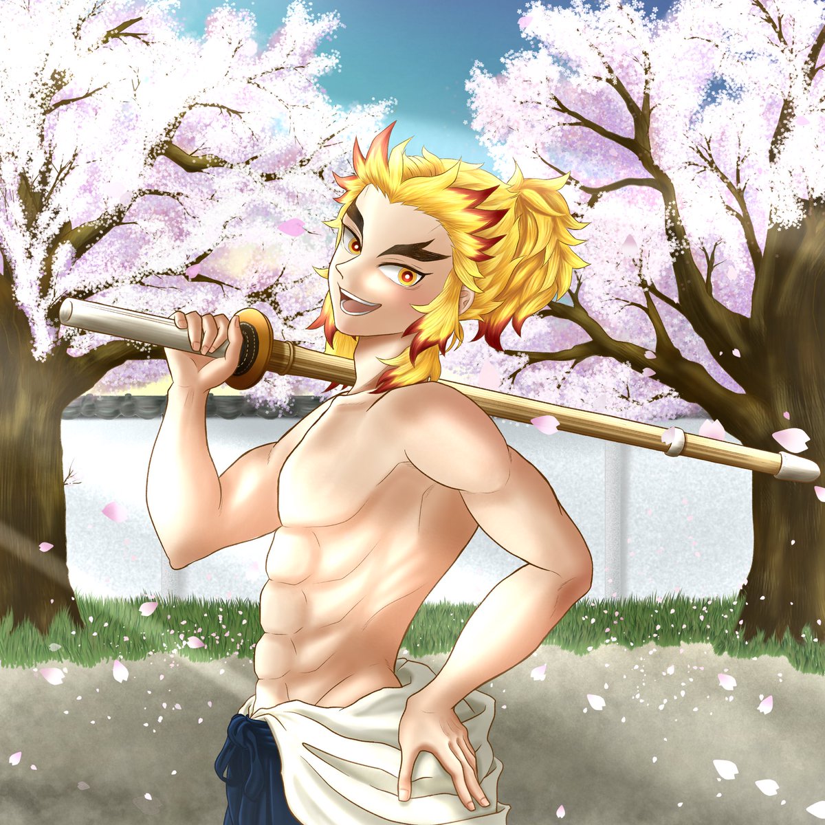 母上の命日に合わせて数日実家に帰省したけど、身体がなまってしまわないように夜通し鍛錬をして朝日を浴びていた所に千寿郎がやって来て「おはよう!」と、クソデカボイスで挨拶をする煉獄さん❤️ #煉獄杏寿郎 #桜 #鬼滅の刃 #鬼滅の刃イラスト