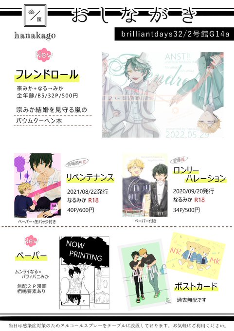 【お品書き】 5/29 brilliantdays32 ●2号館G14a ●花筺/なるみかスペ 🌕無配ペーパーはムンライ椚なる×パフィバニみか 🧸無配ポストカードは前回前々回参加時のものなのでご希望の方はお声がけください 新刊サンプル⇒twitter.com/hnk_wata/statu…