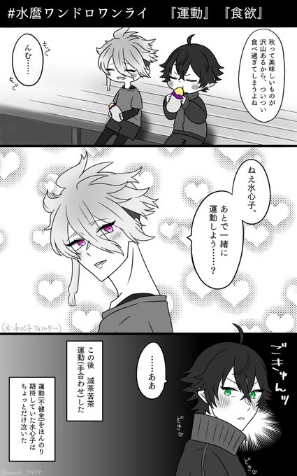 #水麿ワンドロワンライ @simr60min お題『食欲』『運動』 両方お借りしました! 下描き1時間、ペン入れ諸々1時間です…… お付き合いしている水麿ちゃんで、すいくんがちょっと思春期っぽいです😳
