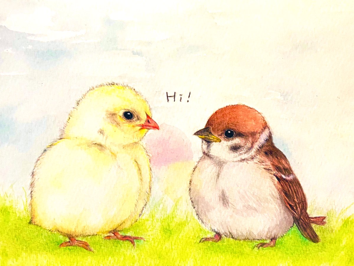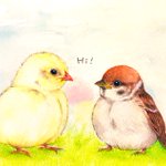 前の投稿にいいねたくさんありがとうございました🐰🌸 絵を描けてないので過去絵 ひよこと子スズメの出会い🐥🐣 #ヒヨコ #スズメ #水彩画 #動物イラスト #アナログ画 #アナログイラスト #ゆるいイラスト #過去絵