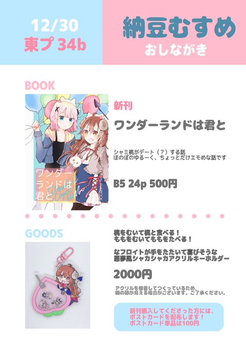 あなたのサークル「納豆むすめ」は、コミックマーケット101で「金曜日東地区 "プ " 34b」に配置されました!コミケWebカタログにてスペース配置場所公開中です! webcatalog.circle.ms/Circle/Map/168… #C101WebCatalog 冬コミ受かってた!!!!!まぞくのシャミ桃です!!!!!!!!!!