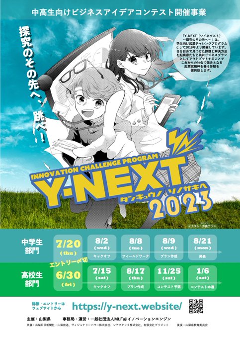 【おしらせ】 この度山梨県の中高生向けビジネスアイデアコンテスト『Y-NEXT2023』のポスターイラストを担当させていただきました!貴重な機会をありがとうございます。 本日高校生部門のエントリー締切のようですので起業に興味のあるナウでヤングな方は是非! 🔥 y-next.website