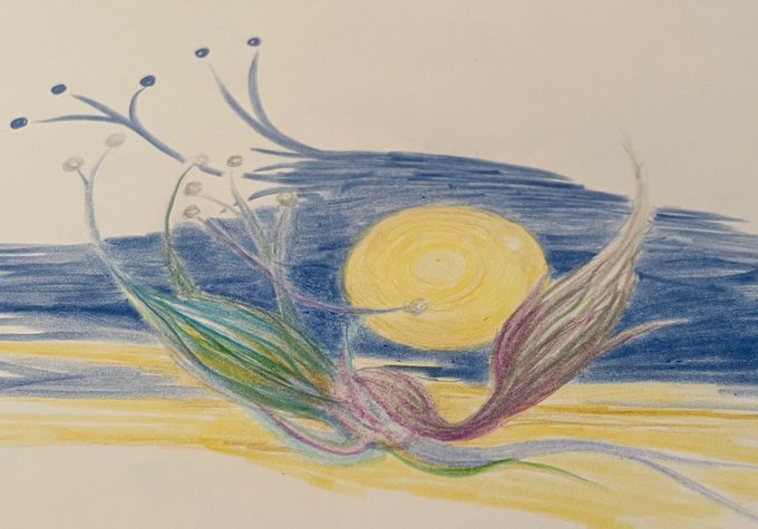 0 4 月に見立てて (ほんとうは太陽です。) 楽しみにしていた今夜、本当に残念です。。。 #イラスト #月 #太陽 #幻想的 #パステル #色鉛筆 #癒し? 過去画です。後で拡大版 のせます。 21/09/21 19:32