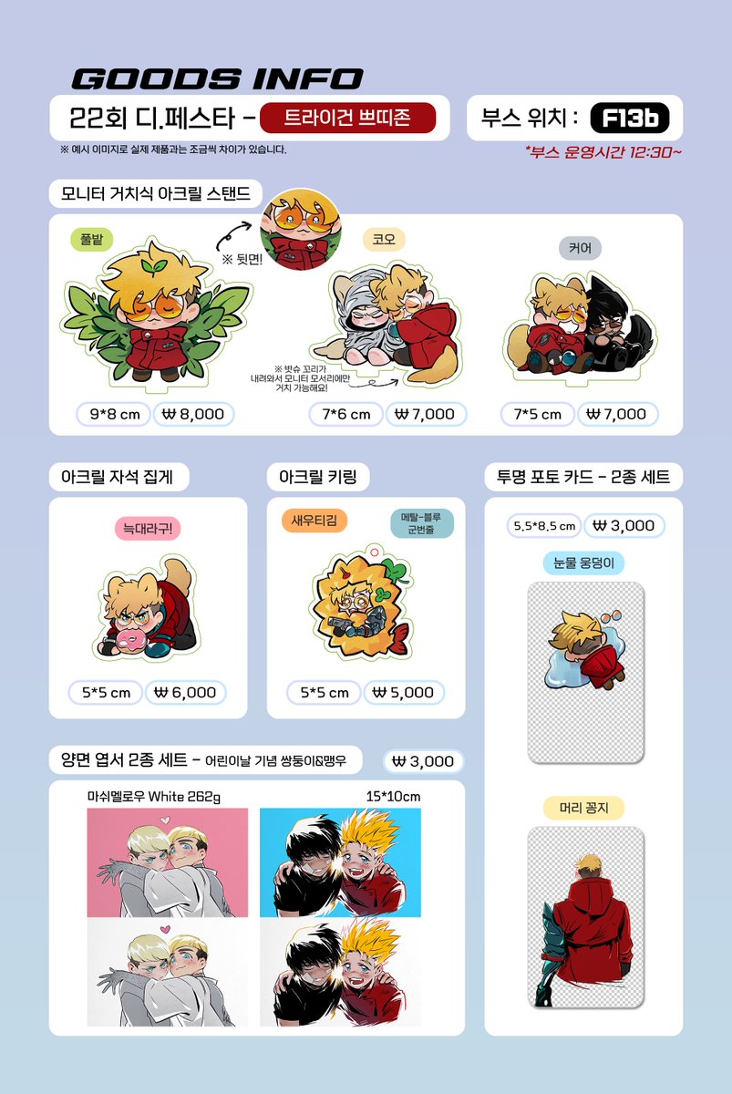 7/22 (토) 디.페스타 < 트라이건 쁘띠존 > F13b 부스 트라이건 밧슈&나이&울프우드 굿즈들 챙겨갑니다~ ★부스 오픈시간 12:30 부터~! 지나는 길에 무료 배포 엽서와 스티커 데려가세요~🤗 ~ 7/20(목) 23:30까지 선입금 예약 받고있습니다. witchform.com/deposit_form/4…