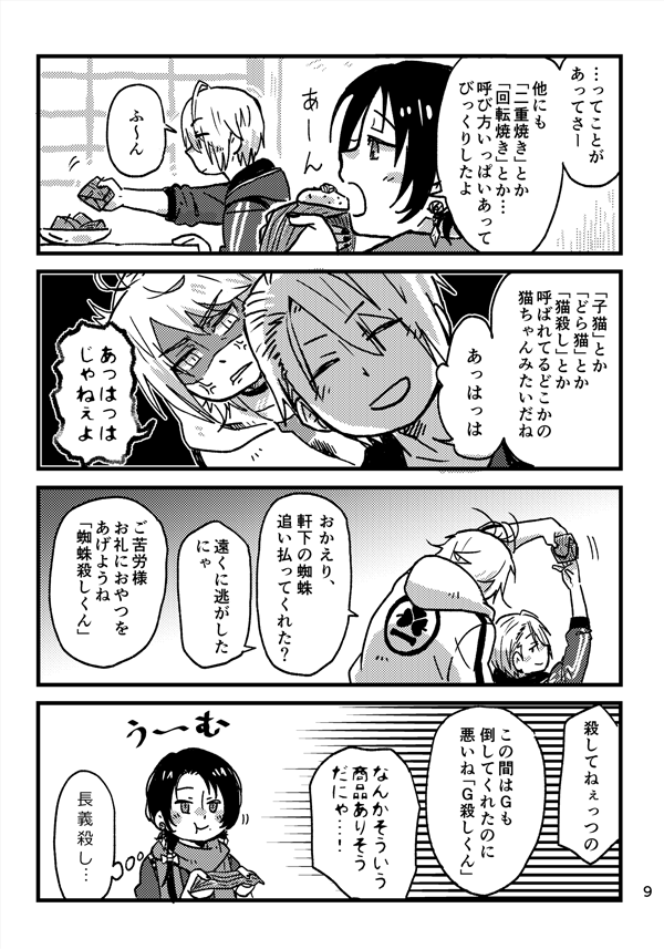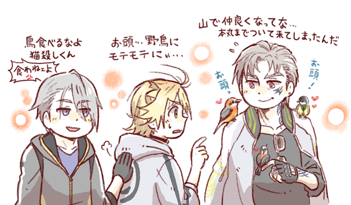 86 425 お題【南泉くんと山姥切長義くんと山鳥毛さんをリクエストよろしいでしょうか…!】 南泉「お前らのお頭じゃねぇ!オレのだ、にゃ!!!!!」 長義「ヤキモチ妬く暇あったら厨で秋刀魚でも焼いてきなよ」 20/10/11 22:24