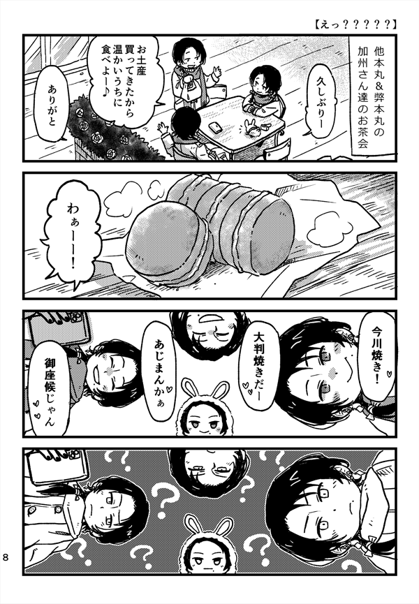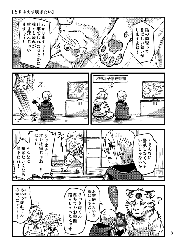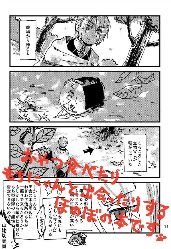 63 291 11月28日開催の閃華の刻火華2021の新刊サンプルです…!長義さんと南泉さんと小夜隊長がわいわいしてるところにもちマス本丸の南泉さんが来たりするほのぼの本です🐾 21/11/27 17:52