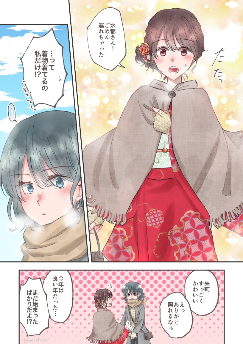 あけましておめでとうございます! 初詣に行く百合です⛩ 今年もたくさん百合描くのでよろしくお願いします!✊カラー漫画初めて描いたけど楽しいな #創作百合 #漫画が読めるハッシュタグ twitter.com/hokekesei/st…