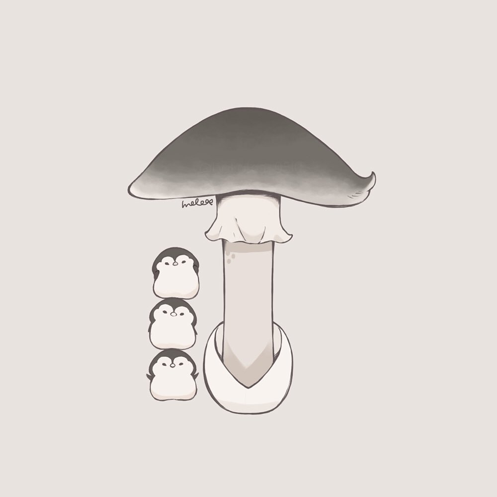 食べられないきのこシリーズ、クロタマゴテングタケ🍄 見た目はシンプルだけど猛毒なキノコ。分かりにくいけど、ペンギンたちは翼で卵の形を作ってます。 #イラスト #オリジナルイラスト #illustration #創作