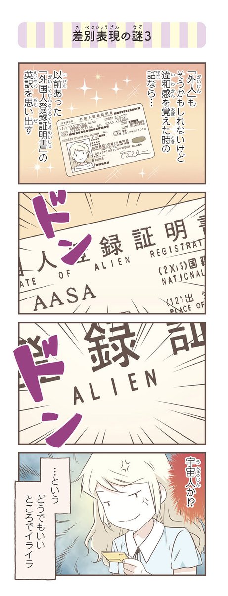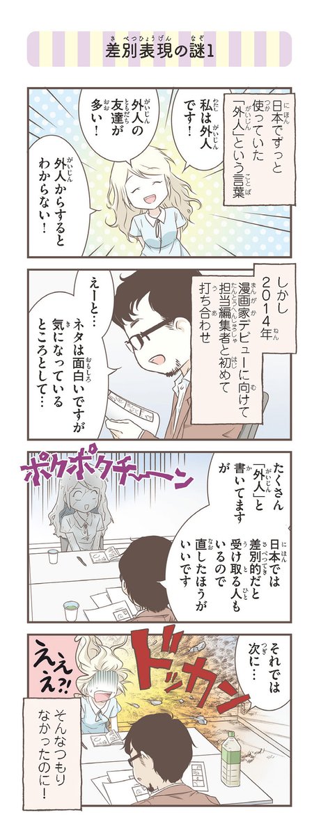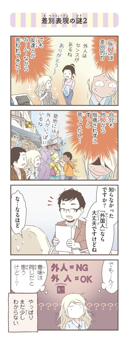 来日10周年のため、『北欧女子オーサが見つけた日本の不思議⑤』より:「差別表現の謎1」! これはショックだったわ…! アマゾンリンク: amazon.co.jp/dp/4040647920/…