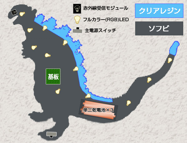 #なんでそのギミック仕込もうと思ったのか選手権 赤外線リモコンで 赤(通常)、青(熱線発射)切替発光 口部開閉と連動で下顎開閉 「光った方が楽しいかも」と 思ったから ( ・∀・)bデス