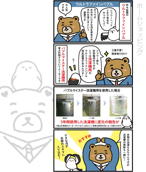 #くま店長のお知らせ 洗濯物のニオイ…気になりません? 今ある洗濯機につけるだけで ウルトラファインバブルが発生します🐻 #四コマ漫画 #漫画が読めるハッシュタグ #北海道公式中の人の会 #企業公式が毎朝地元の天気を言い合う #企業公式つぶやき部 #企業公式 #企業公式春のフォロー祭り twitter.com/homeshop_s/s…