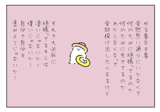 やる事なす事全然思い通りにいかなくて、何のために頑張ってるのか?何のために生きてるのか?わからなくなって全部投げ出したくなるけどそれでも必死に頑張ってるキミは凄いじゃないか!偉いじゃないか!自分で自分を褒めてあげようじゃないか!