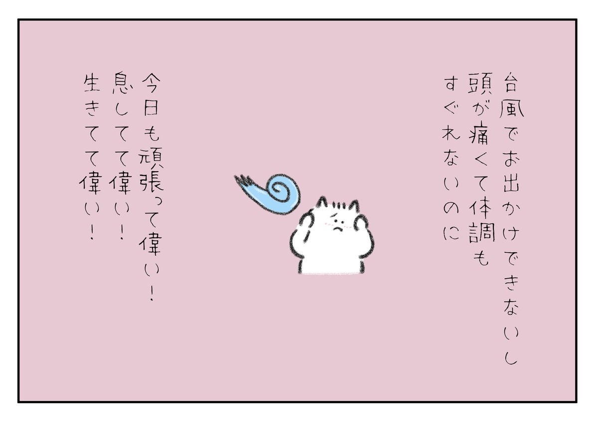台風でお出かけできないし頭が痛くて体調もすぐれないのに今日も頑張って偉い!息してて偉い!生きてて偉い!!!