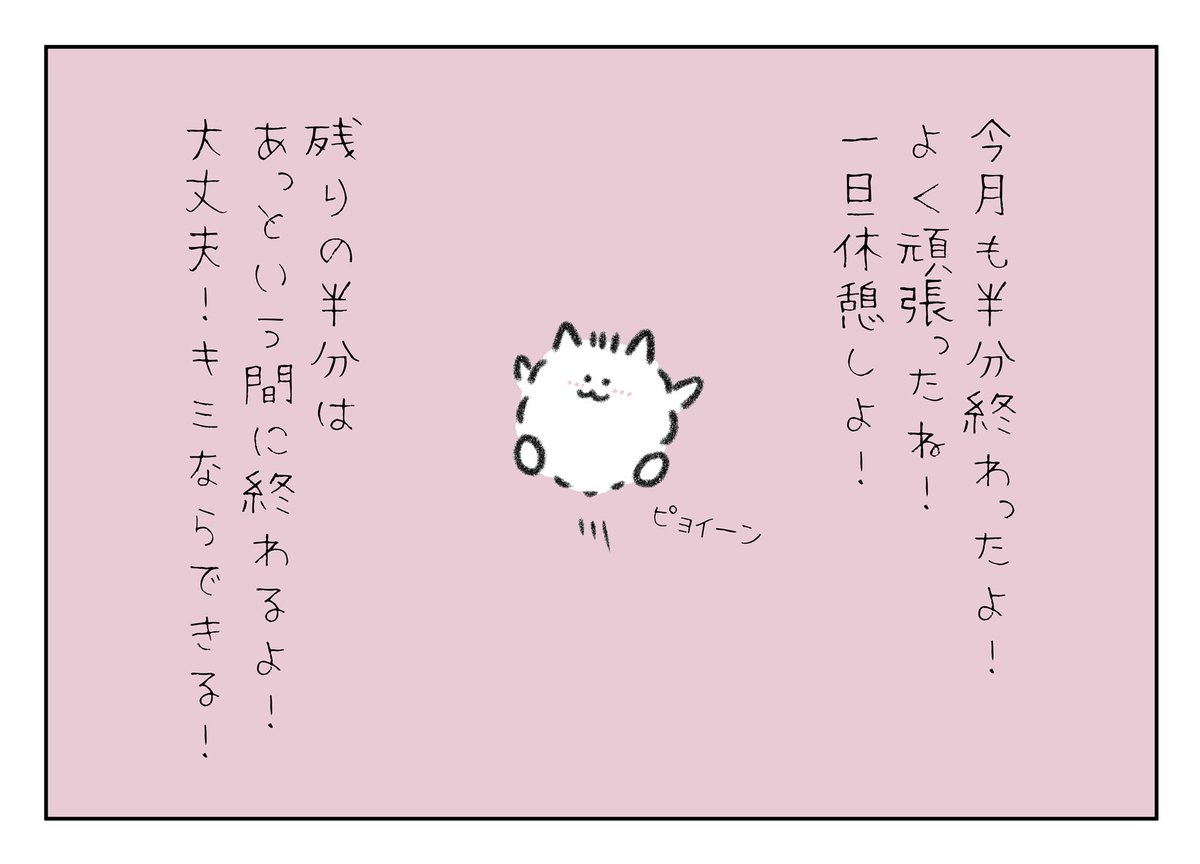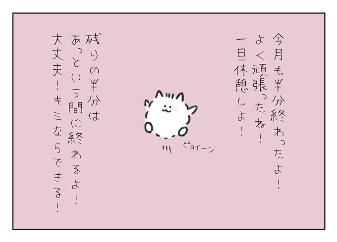 今月も半分終わったよー! よく頑張ったね!一旦休憩しよう! 残りの半分はあっという間に過ぎるよ! 大丈夫!キミなら必ずできる!