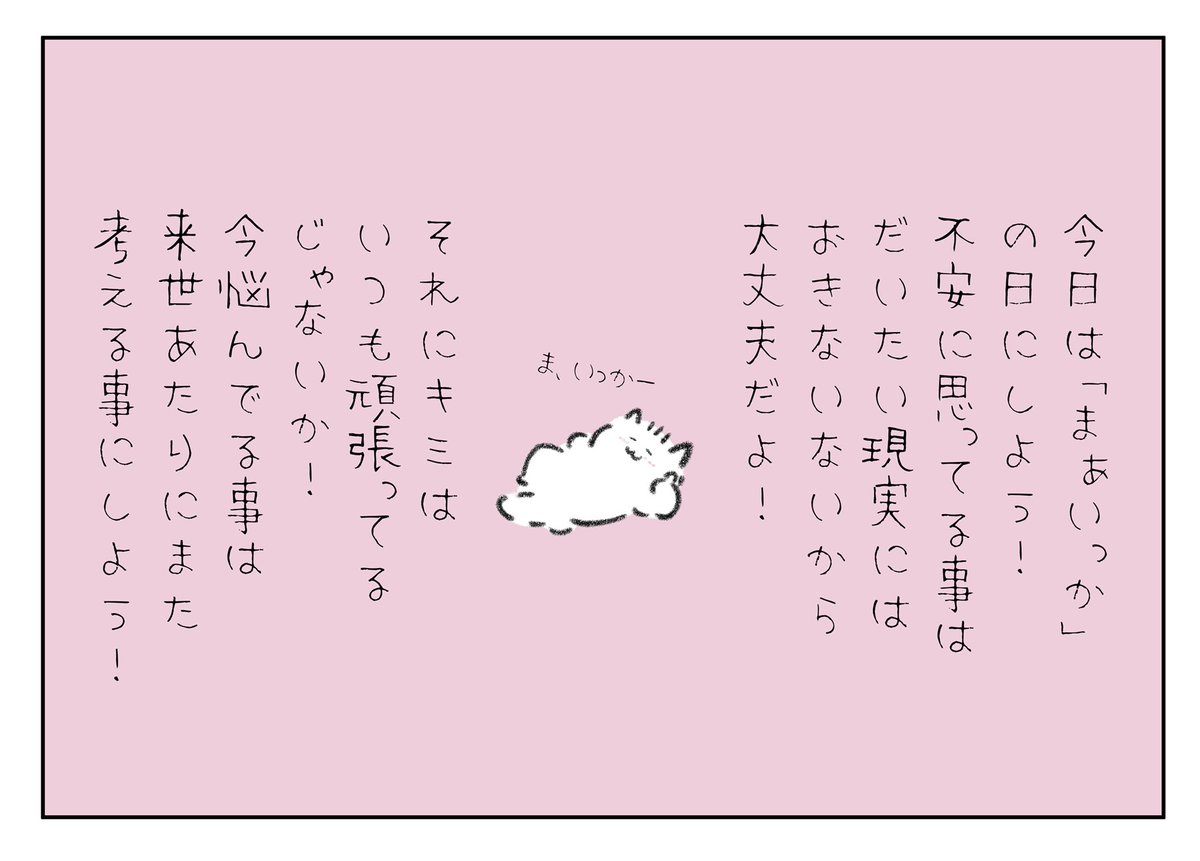 今日は「まぁいっか!」の日にしよう! 不安に思ってる事は大体現実にはおきないから大丈夫だよ!それにキミはいつも頑張ってるじゃないか!今悩んでる事は来世あたりにまた考える事にしよう!