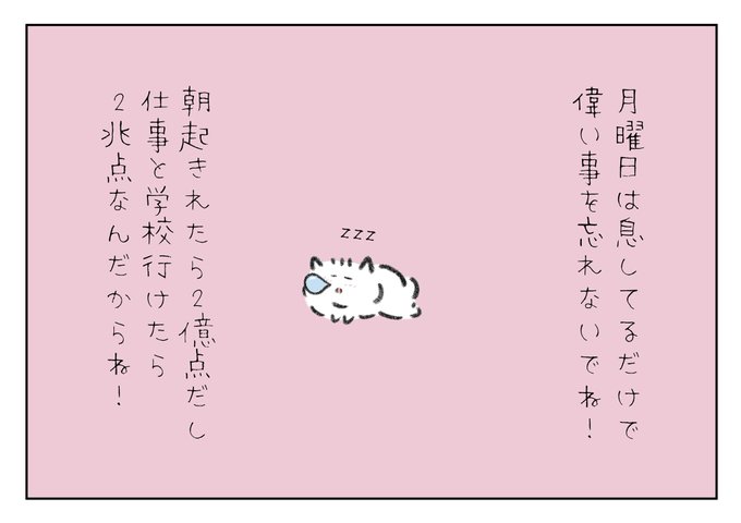 月曜日は息してるだけで偉い事を忘れないでね!朝起きれたら2億点だし仕事とか学校に行けたら2兆点なんだからね!