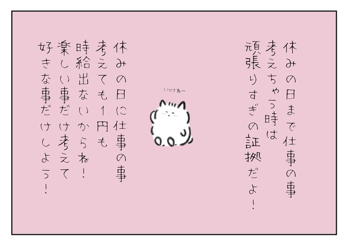 休みの日まで仕事の事を考えちゃう時は頑張りすぎの証拠だよ! 休みの日に仕事の事考えても1円も時給は出ないから楽しい事だけ考えて好きな事だけしようね!