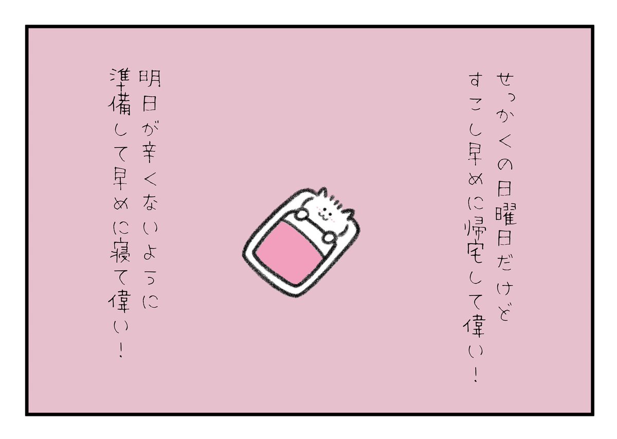 せっかくの日曜日だけど少し早めに帰宅して偉いね!明日が辛くないように準備して早めに寝て偉いよ!