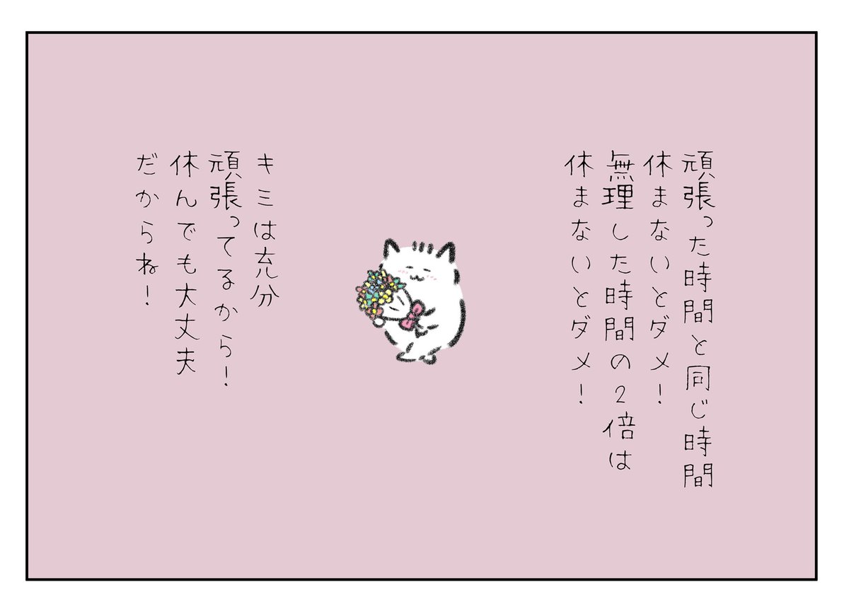頑張った時間と同じ時間休まないとダメ!無理した時は無理した時間の2倍は休まないとダメ!キミは充分頑張ってるから!休んでも大丈夫だからね!