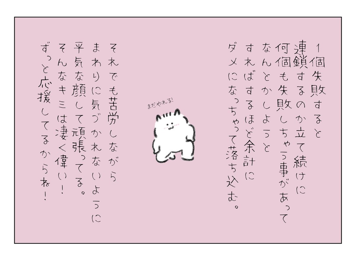1個失敗すると連鎖するのか立て続けに何個も失敗しちゃう事があって、なんとかしようとすればするほど余計にダメになっちゃって落ち込む😞 それでも苦労しながらまわりに気づかれないように平気な顔して頑張ってるんだよね!そんなキミは凄く偉い!ボクはずっと応援してるからね🤜🤛