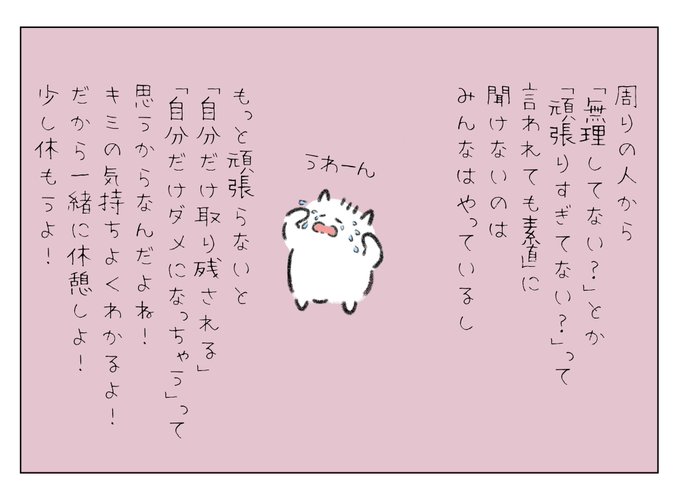 53 352 周りの人から「無理してない?」「頑張りすぎてない?」って言われても素直に聞けないのは、みんなはやっているしもっと頑張らないと「自分だけ取り残される」「自分だけダメになっちゃう」って思うからなんだよね!キミの気持ちとってもよくわかるよ!だから一緒に休憩しない?少し休もうよ! 23/06/22 20:13