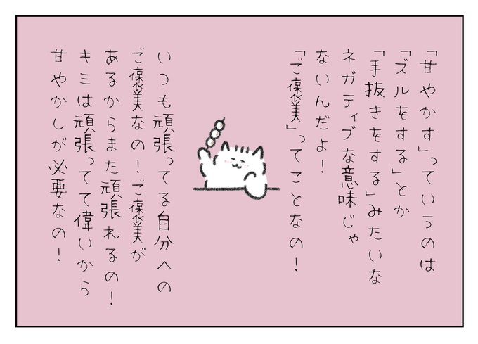 71 410 「甘やかす」っていうのは「ズルをする」とか「手抜きをする」みたいなネガティブな意味じゃなくていいんだよ!「ご褒美」って事なの!いつも頑張ってる自分へのご褒美!ご褒美があるからまた頑張れるの!キミは頑張ってて偉いから甘やかしが必要なんだよ! 23/06/28 20:30