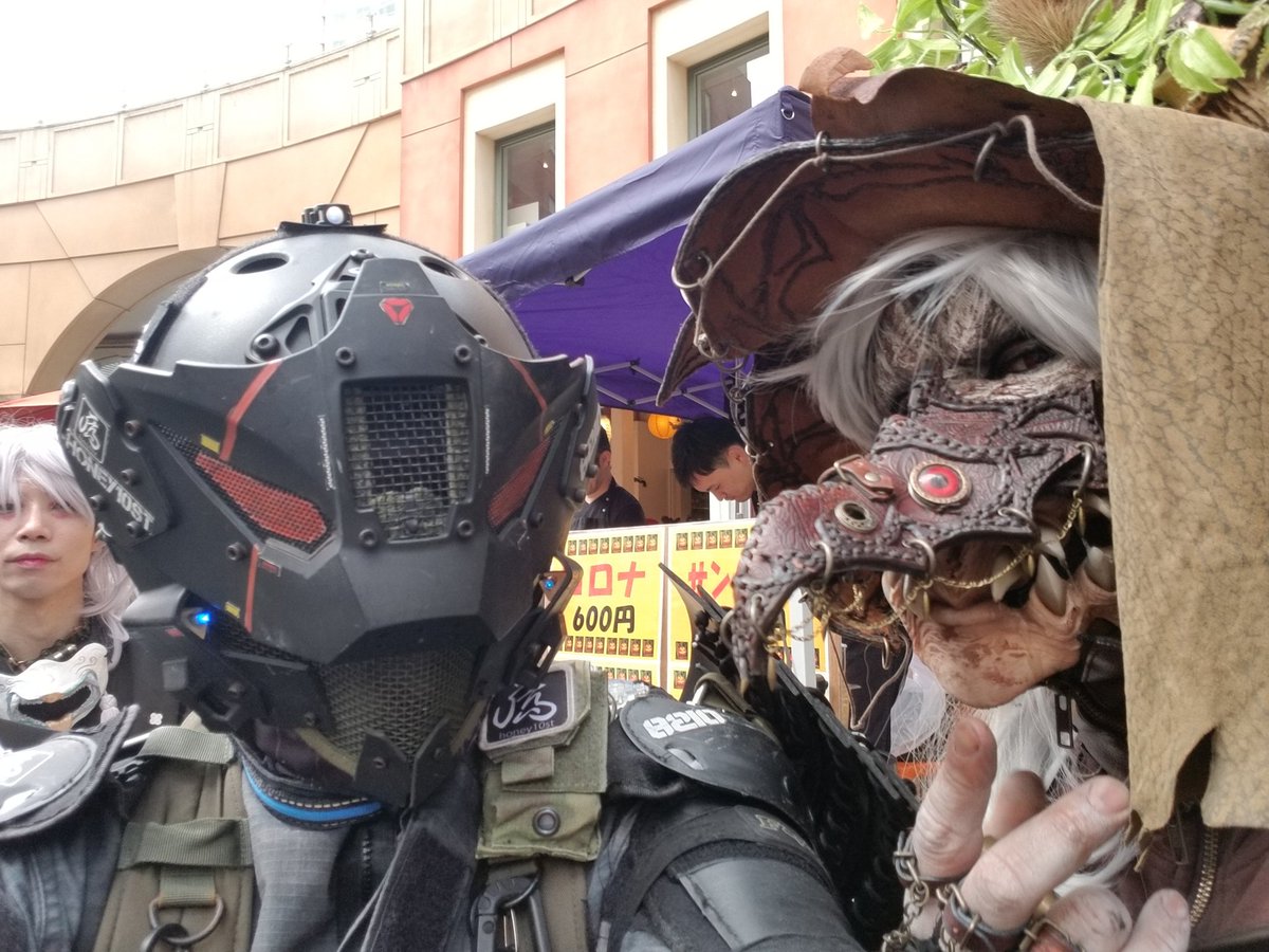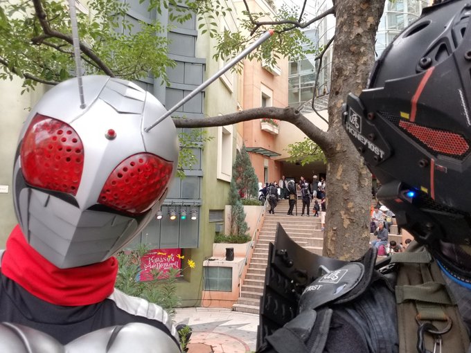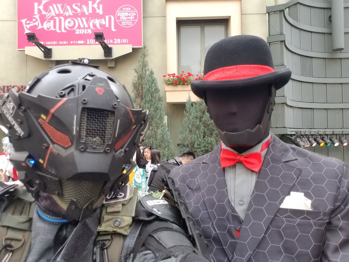 6 17 本日のお写真!待ち合わせ場所ですぐに目についた仮面ライダーXにはテンション上がった!私のマスクと同じやつを顎にされてる方は一緒にとるしかない!しめ鯖さんとご友人二人は尊かったです。 #川崎ハロウィン 18/10/28 23:46