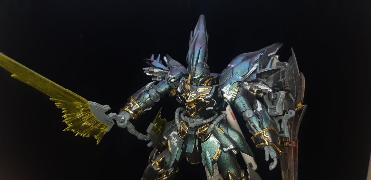 #6月になったのでフォロワーさんに自己紹介しようぜ 技術は無いですが、色んなアイディアを拾いまくって楽しんでるモデラーです。 この偏光塗装もブラックライト発光も背景の大黒門も、全部Twitterで学びました。 #ガンプラ好きと繋がりたい #ガンプラの画像を貼るとRTされると聞いて