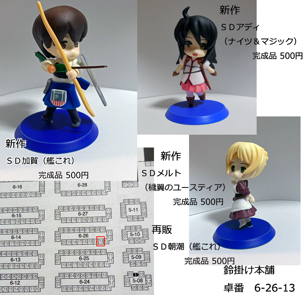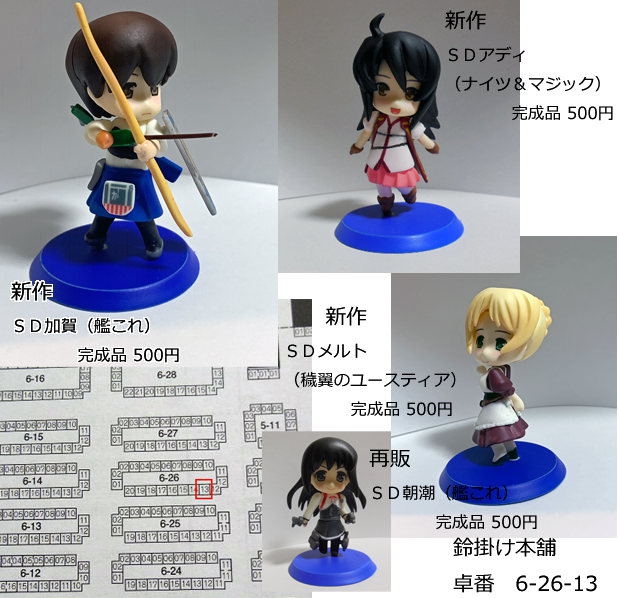 30 37 【告知】 鈴掛け本舗 6-26-13 新作は艦これよりSD加賀 ナイツ&マジックよりSDアディ 穢翼のユースティアよりSDメルト 完成品販売で各500円となります。 #wf2020w #艦これ #ナイツマ #オーガスト 20/02/02 17:51