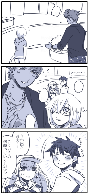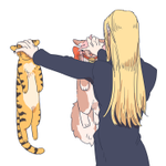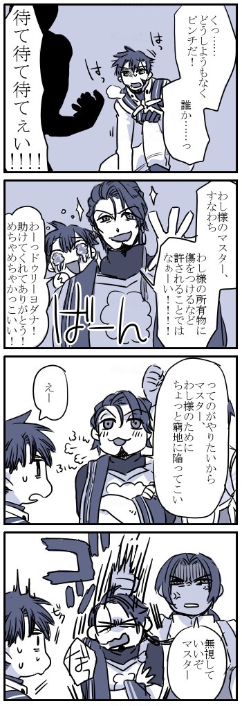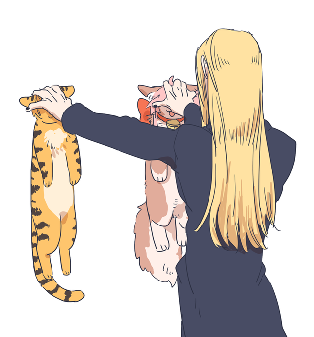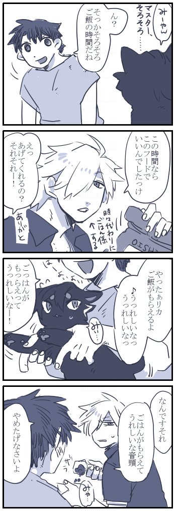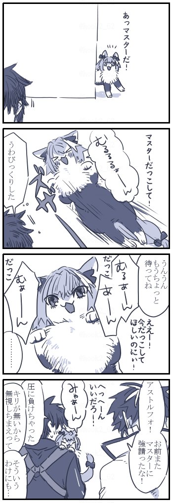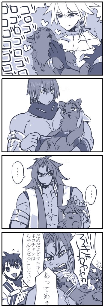 お題箱より ネコチャン漫画 > わし様ネコチャンの三者三様の抱き方 カルナ:両手で大事そうに喉を撫でながら抱きかかえてる。わし様ネコチャンご満悦… #odaibako_hook2_62 odaibako.net/detail/request…… 自陣営にはめちゃめちゃ懐くよだにゃん可愛いなあと思いながら描いてました。